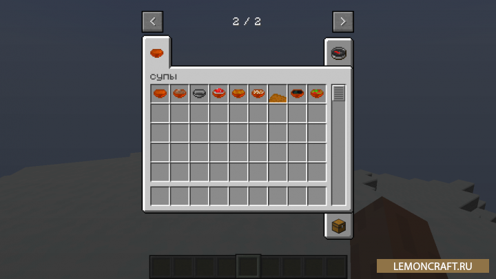 Мод на новые супы Soups даст вам возможность насладится вкусом 6 видов новых супов, которые добавляет мод. Супы можно сварить из коричневых грибов, из мухоморов, из яблок. Так же вы сможете отведать хлопья с молоком и суп из морепродуктов.